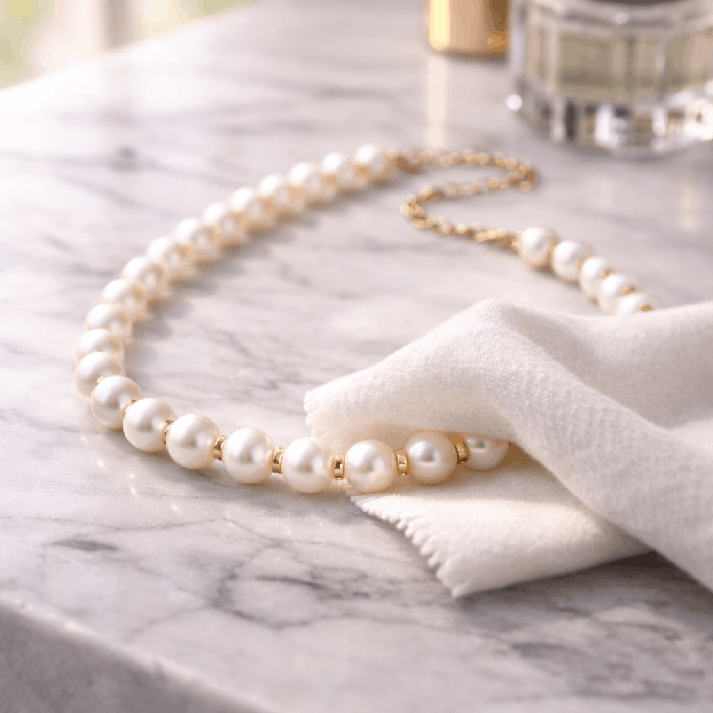 Når du kommer hjem, ta perlene av med det samme. Før du vasker ansikt eller hender. Før du smører nattkrem. Ta dem av og tørk dem forsiktig med en myk klut. Slik fjerner du hudoljer før de bygger seg opp og gjør glansen matt. Tar kanskje tretti sekunder. Men denne enkle vanen hindrer det meste av skaden som oppstår ved daglig bruk. Du fjerner skitten før den blir et problem som krever dyp rengjøring.